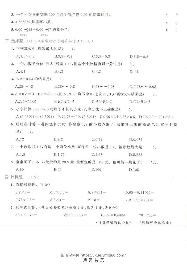 五年级上数学小数乘除法专项测试卷《人教版》小悦老师3个月前发布关注私信318五年级上数学小数乘除法专项测试卷《人教版》此内容为付费资源,请付费后查看会员专属资源年度会员免费永久会员免费您暂无购买权限,请先开通会员开通会员格式pdf页数5 页大小5.94 MB付费资源 ——预览已结束,还剩3页未读——开通会员后可免费下载高清完整文档 © 版权声明本站资源部分来自网络,由老师收集整理,如有侵犯你的权益请联系站长vx:y6499640 我们会第一时间进行审核删除。站内资源为网友个人学习或测试研究使用,未经原版权作者许可,禁止用于任何商业途径!请在下载24小时内删除! 如遇到资源下载失败问题,请联系VX:y6499640THE END小学数学 喜欢就支持一下吧点赞8 分享QQ空间微博QQ好友海报分享复制链接收藏